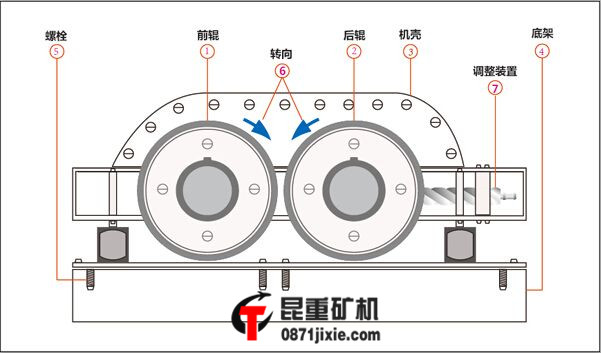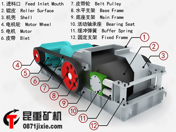 兩輥輪之間裝有楔形或墊片調(diào)節(jié)裝置,楔塊向上拉起時,楔塊將活動輥輪頂離固定輪,兩輥輪間隙變大,出料粒度變大,當楔塊向下時,活動輥輪在壓緊彈簧的作用下兩輪間隙變小,出料粒度變小。墊片裝置通過增減墊片數(shù)量或厚薄來調(diào)節(jié)出料粒度大小,增加墊片時兩輥輪間隙變大,出料粒度變大。