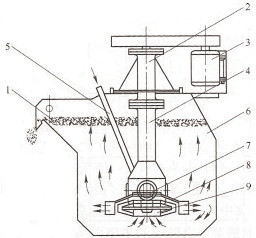1、刮板;2、軸承體;3、電機(jī);4、中心筒;5、吸氣管;6、槽體;7、主軸;8、定子;9、葉輪。