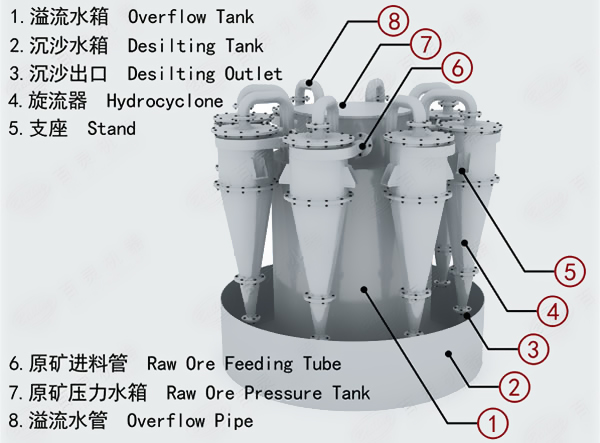 水力旋流器下部是圓錐形殼體,上部連接圓柱形殼體。圓柱形殼體上口封死,中間有一層底板,底板中央插入一短管溢流管,在底板下部沿圓柱形殼面的切線方向連接有給礦管口,在底板之上沿殼體切線方向連接有溢流排出管口,錐體最下端有可更換的沉砂排出嘴。水力旋流器多用耐磨鑄鐵制造,為減低殼體內壁的磨損速度,還常用輝綠巖鑄石、耐磨橡膠等耐磨材料作襯里。